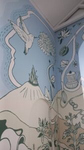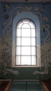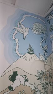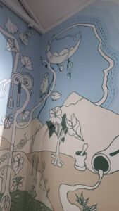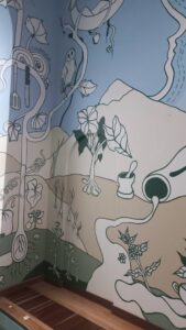 El mural, realizado con pinturas de vinilo y brochas, recorre las plantas que acompañan las cocinas del campo colombiano, la diversidad geográfica del país y objetos cotidianos cargados de sentido simbólico, dando vida a la escenografía de una olla comunitaria que resguarda mensajes de personas afectadas por el conflicto, parte del legado de la Comisión de la Verdad salvaguardado por el Museo.